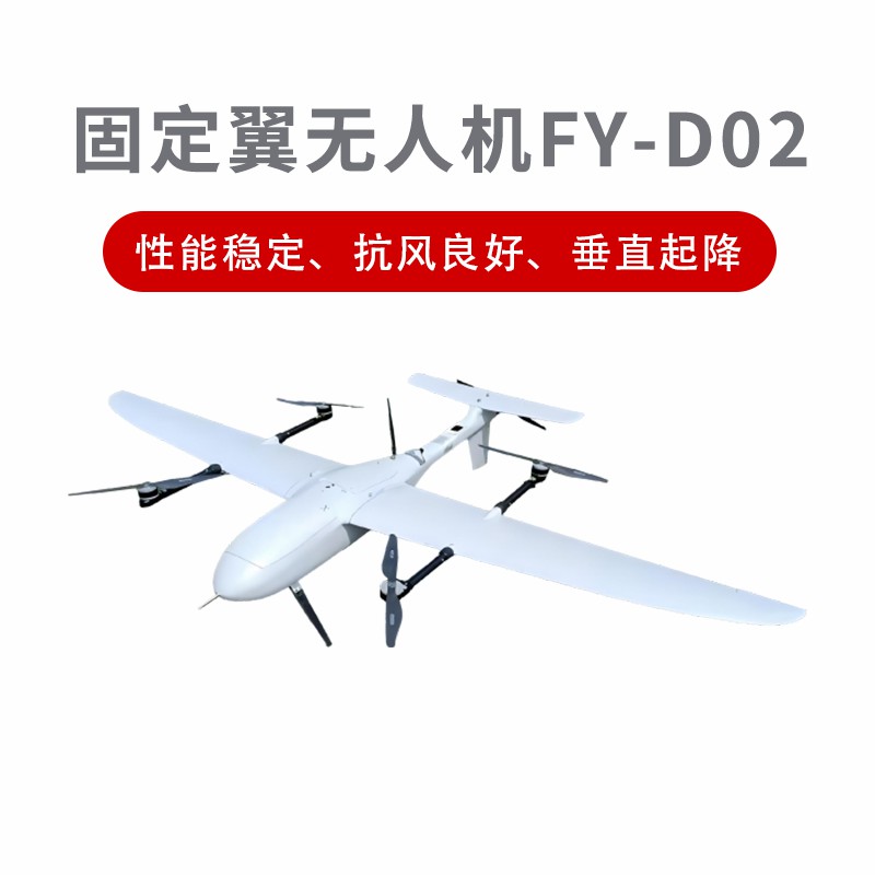 垂直起降固定翼无人机FY-D02型,采用热压罐成型的全复合材料打造,机身、机翼与垂直起降臂各有适配材质。具备垂直起降能力,动力系统强劲,搭配高性能电池。飞行性能稳定,飞行与巡航速度可观,抗风能力良好,续航时间长。外形设计合理,翼展与机长比例协调,机腹有一定离地间隙。在特定海拔、飞行高度与风力条件下,挂载后仍能保持稳定的巡航表现。